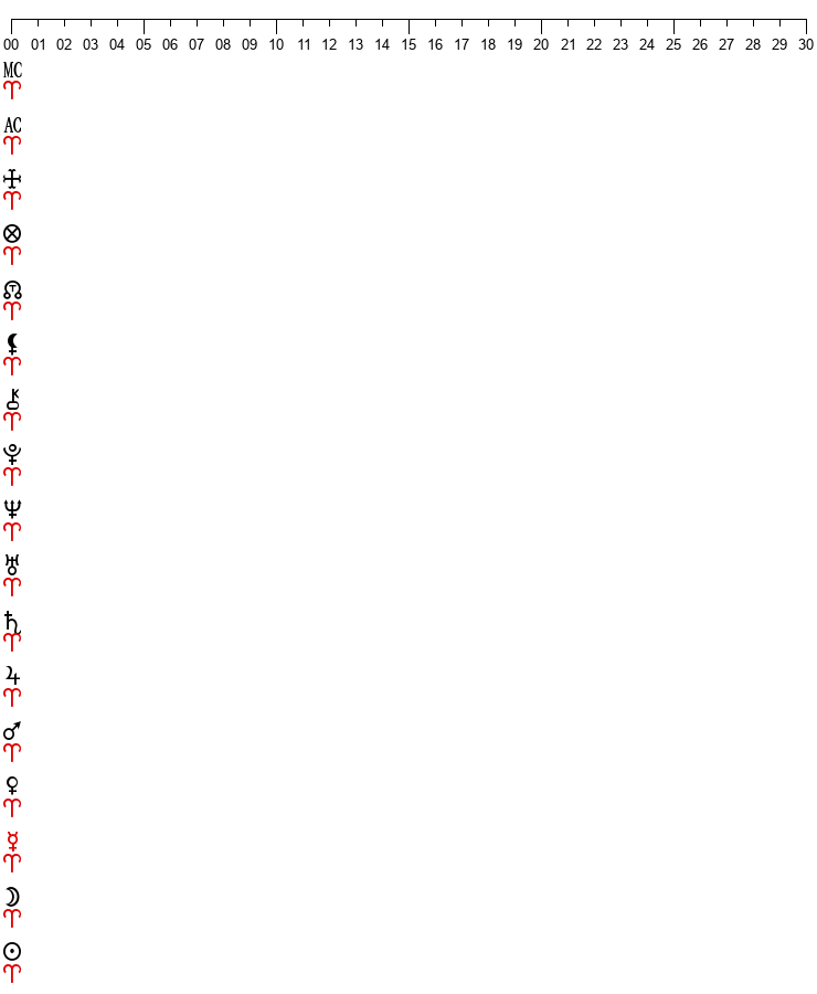 | Vertex/Ascendente = 15 Vir 32 | Vertex/Medio Cielo = 07 Leo 32 | |